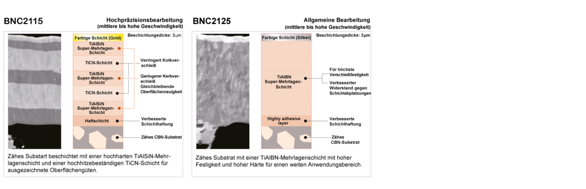 Die Aluminiumoxid-Beschichtung mit einer sehr hohen Festigkeit gewährleistet eine hervorragende Stabilität und Verschleißfestigkeit bei der Bearbeitung von Schmiedewerkstoffen. Durch die goldfarbene Beschichtung sind die verwendeten Schneidecken leicht zu erkennen. Es ist ideal zur Bearbeitung von Stahl mit mittlerem bis hohem Kohlenstoffgehalt (C30, 1.0528), von legiertem Stahl (34CrMo4, 1.7220) und Wälzlagerstahl (100Cr6, 1.3505) geeignet.