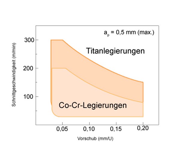 - Durch höchste Härte und Wärmeleitfähigkeit ist im Vergleich zu derzeitigen Hartmetallwerkzeugen die Hochgeschwindigkeitsbearbeitung von Titan- und Co-Cr-Legierungen mit deutlich längeren Standzeiten möglich.