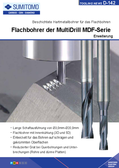 Die Flachbohrer der MultiDrill MDF-Serie sind beschichtete Vollhartmetallbohrer für das Anbohren auf schrägen und gekrümmten Oberflächen. Durch den Spitzenwinkel von 180° ist der MDF-Typ in einer Vielzahl von Bohranwendungen einsetzbar.