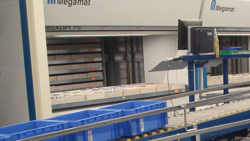 Installation eines automatischen Lagersystems in Willich mit vier vertikalen Liftsystemen, einem Schnelldreherregal, traditionellen Regalen und einem Fördersystem.