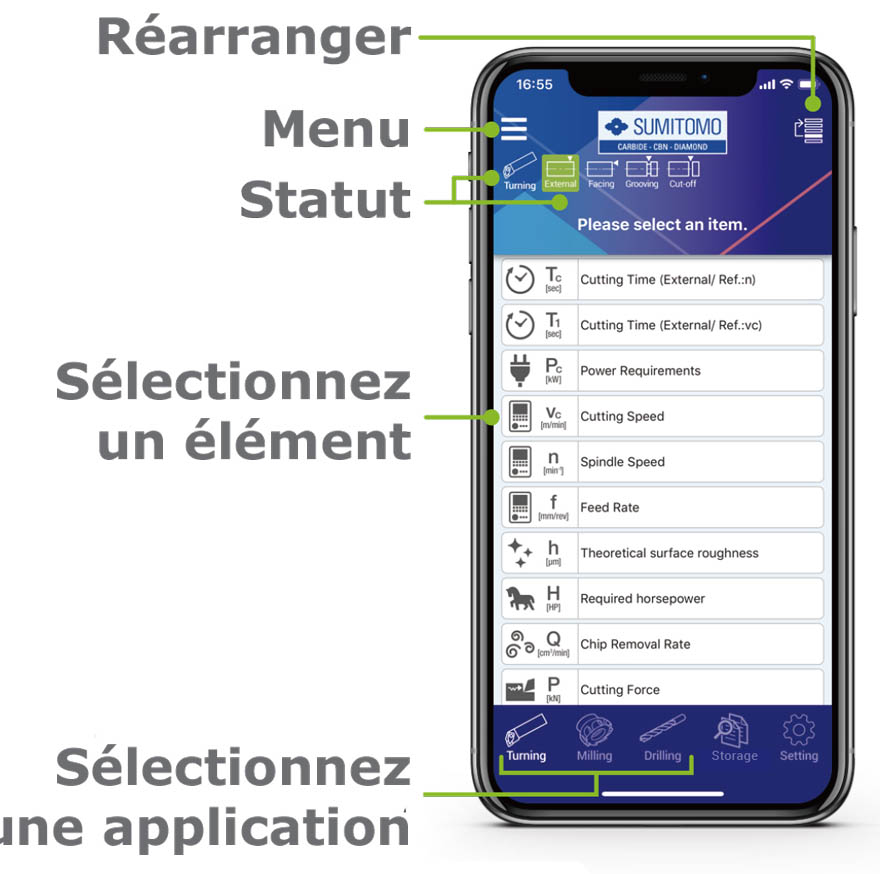 Notre application SumiTool Calculator gère les équations complexes utilisées pour le tournage, le fraisage et le perçage. Il suffit de sélectionner l'élément requis et d'entrer les chiffres pour le calcul automatique. Scannez le code-barres ci-dessus ou ouvrez votre Apple Store ou votre Google Play Store et téléchargez la calculatrice SumiTool sous le mot clé "SumiTool" ou "Sumitomo" sur votre appareil mobile. Nous serions très heureux d’obtenir une note de notre application.