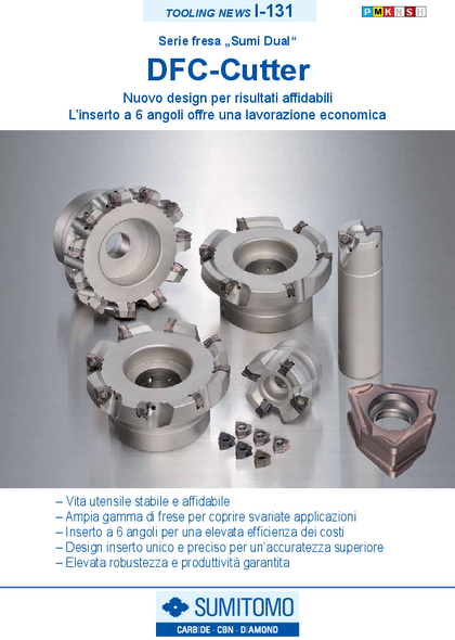 La fresa SumiDual tipo DFC è una fresa ad alta efficienza per spallamento retto con inserti bilaterali a 6 taglienti.