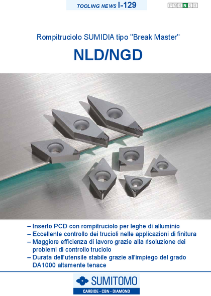 NLD/NGD offre un eccellente controllo dei trucioli nella semi finitura e finitura delle leghe in alluminio. Risolve i problemi di controllo dei trucioli, aumentando considerevolmente l'efficienza di lavoro. Raggiunge una vita utensile stabile grazie all'impiego del grado DA1000 altamente robusto.